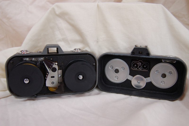 Designed to look like a stills camera – The down side is that the film lacing route is daft – Remember this is 8mm film that’ll need swapping end to end 1/2 way through – in the dark – Took me about 1/2hr. in the daylight when I was looking at it – Looks clever, but far to much trouble.